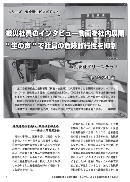当社が推進する「安全人間育成活動」が、労働安全衛生分野の専門誌『労働安全衛生広報』(発行:労働調査会、2025年9月15日号)にて紹介されたことをお知らせいたします。 ※同誌は、安全衛生行政の動向や企業の安全衛生活動事例を広く扱う、実務者向け専門情報誌です。