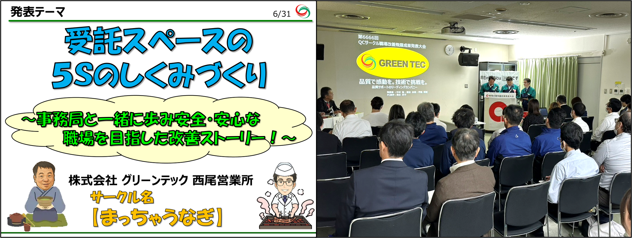 2025年10月17日に開催された「第6666回 QCサークル愛知地区 職場改善飛躍成果発表会」 において、グリーンテック西尾営業所の 「まっちゃうなぎ」サークル がJHS(事務・販売・サービス)チャレンジ部門にて『優良賞』を受賞しました。