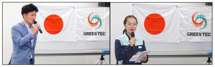 社長挨拶では、 「異国の地で仕事をするなかで、ホームシックや心細くなったりすることがあると思いますが、 配属先でなんでも相談できる環境となっているので心配しないでください。」 と、中島から技能実習生に向けて温かい言葉を贈られました。 そして新入社員代表挨拶では、 「私たちは、日本の綺麗な景色を観たり文化に触れたりすることが日本に来る夢でもありましたが、 日本の検査技術や日本語を勉強し、将来の希望をかなえることを目標として、グリーンテックに入社しました。 その夢や希望を叶えるため、何事にも全力で、また謙虚な気持ちで取り組んでいきたいと思います。」 と、決意表明が行われました。